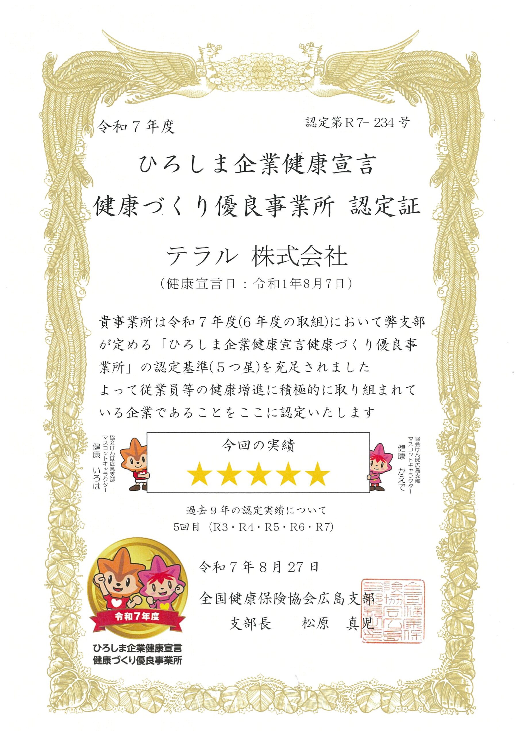 テラル株式会社は、全国健康保険協会広島支部様より「ひろしま企業健康宣言 健康づくり優良事業所(5つ星)」に5年連続で認定されました。 今後も社員が健康的に安心して働き続ける企業として、従業員の健康づくりに積極的に取り組んでまいります。 ひろしま企業健康宣言 健康づくり優良事業所 認定証